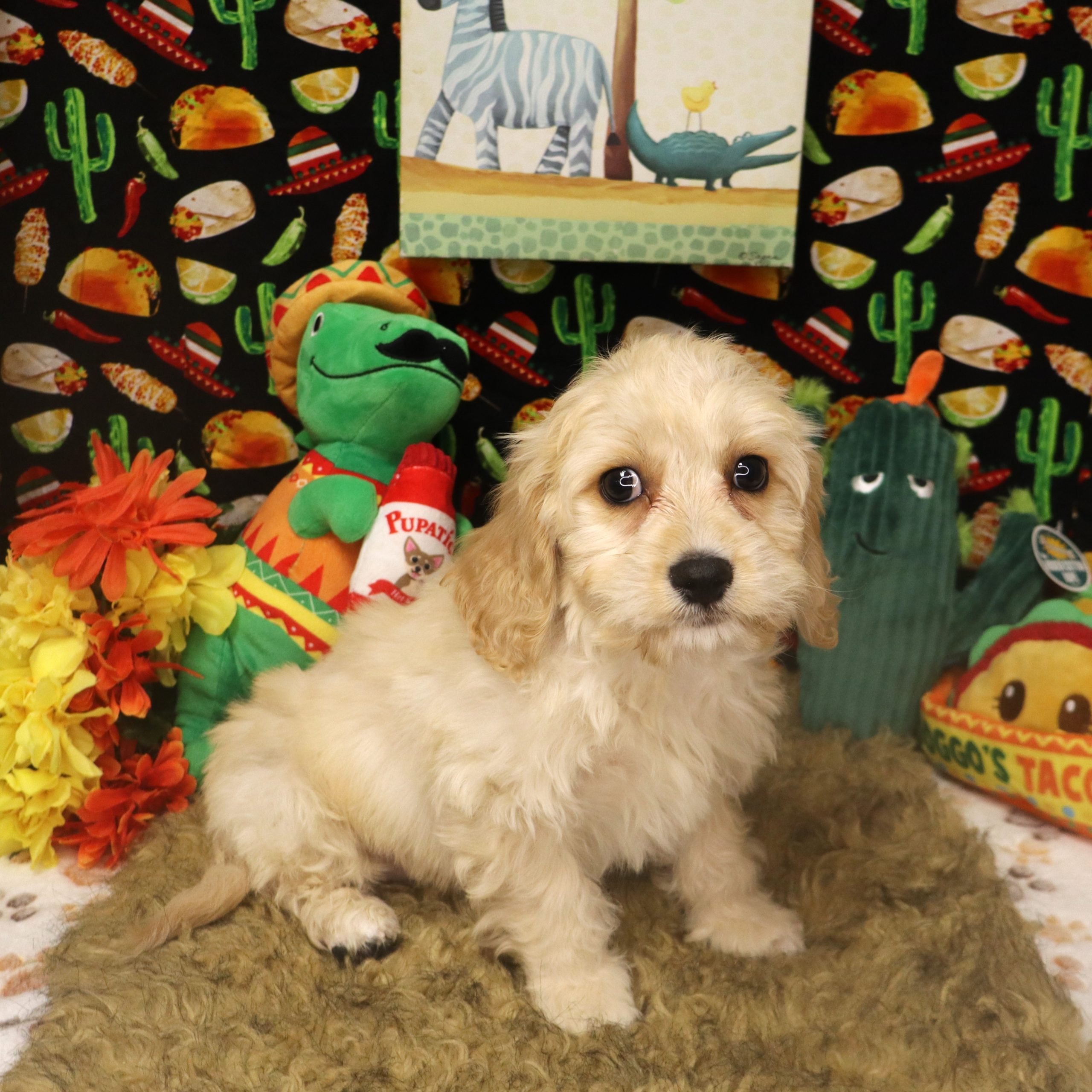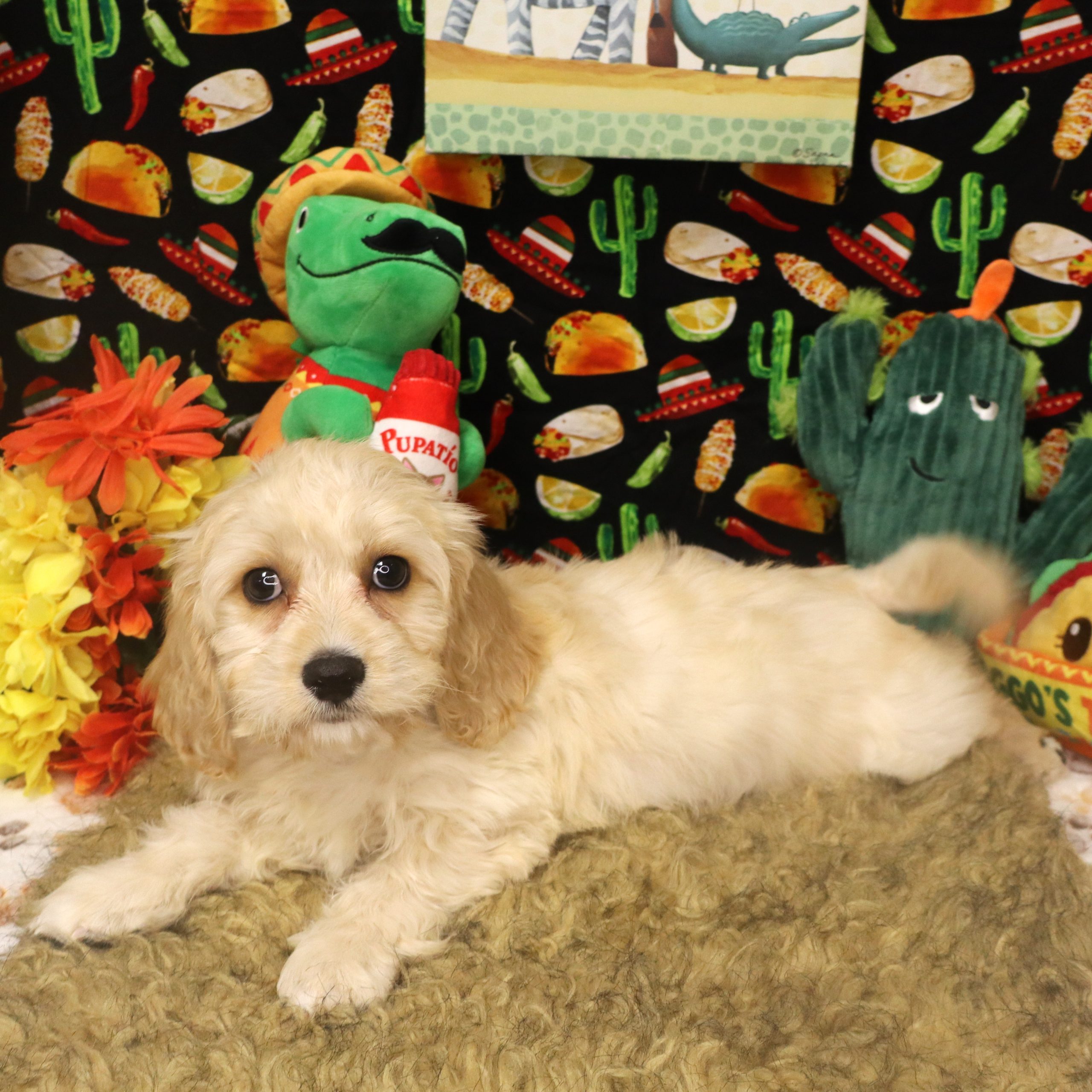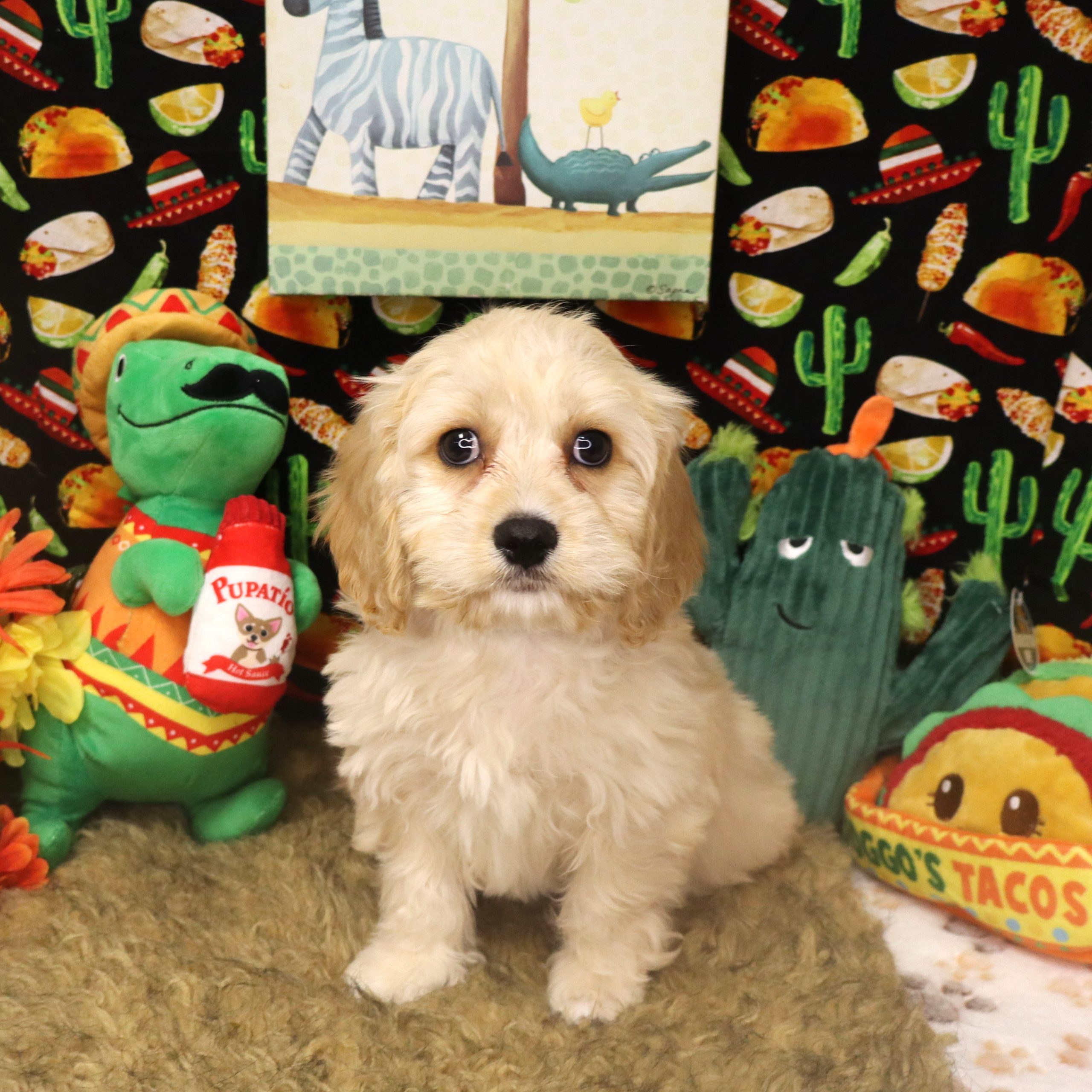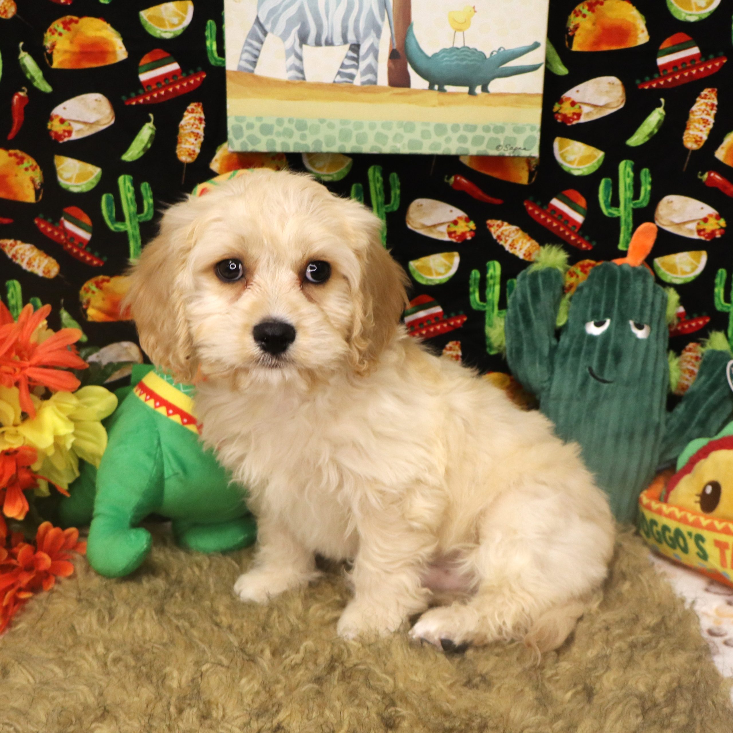 A Cavachon is a mix between a Cavalier King Charles Spaniel and a Bichon. Cavchons continue to be one of the most popular mixes. The Cavachon originates here in the States. They are a very gentle and loving companion dog. They are affectionate with a strong desire to please. Their temperament and personality are unbeatable; this is why they are one of the top mixes. Not to mention their tails never stop and they are always happy, a nice greeting when you come home and have had a bad day. This is the perfect dog for the empty nester or the first time owner. They are great with other pets and children. A Cavachon makes nearly the ideal pet. They adapt well to any environment. Most of their activity needs will be met in the house as their play is more on the gentle side. They will still enjoy outdoor activities with you and walks around the block or trips to the doggie parks. They are an intelligent dog with a high desire to please their owner. They may have a little stubborn side to them, you can thank the Bichon for that, a consistent approach with positive praise and treats will help to overcome this. If you find yourself having a little difficulty with the training process I would suggest that you enroll in some basic puppy classes, this will be good not only for the pup but you as well. Since they have a more sensitive nature please no harsh words or treatment. A firm NO will be all they need. Their coat is generally fluffy and is considered to be a low shed and low allergy dog but will not be the best choice for those of you with allergies, sorry. You will need to comb their coat out a couple times a week with a hard comb or pin brush, a slicker brush will turn them into a fuzz ball. We will also need to go to the groomers about every 8 to 12 weeks where they will wash, clip and trim their nails. This is a great family dog who wants nothing more than to be with you. They will make you smile every time you see them.