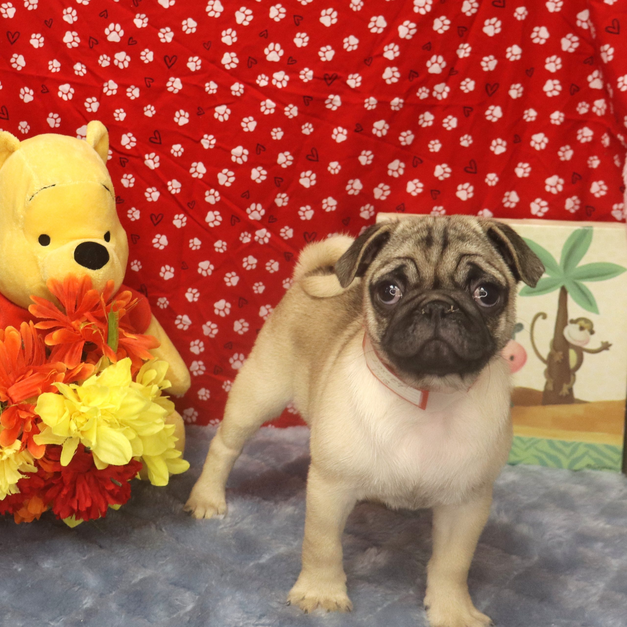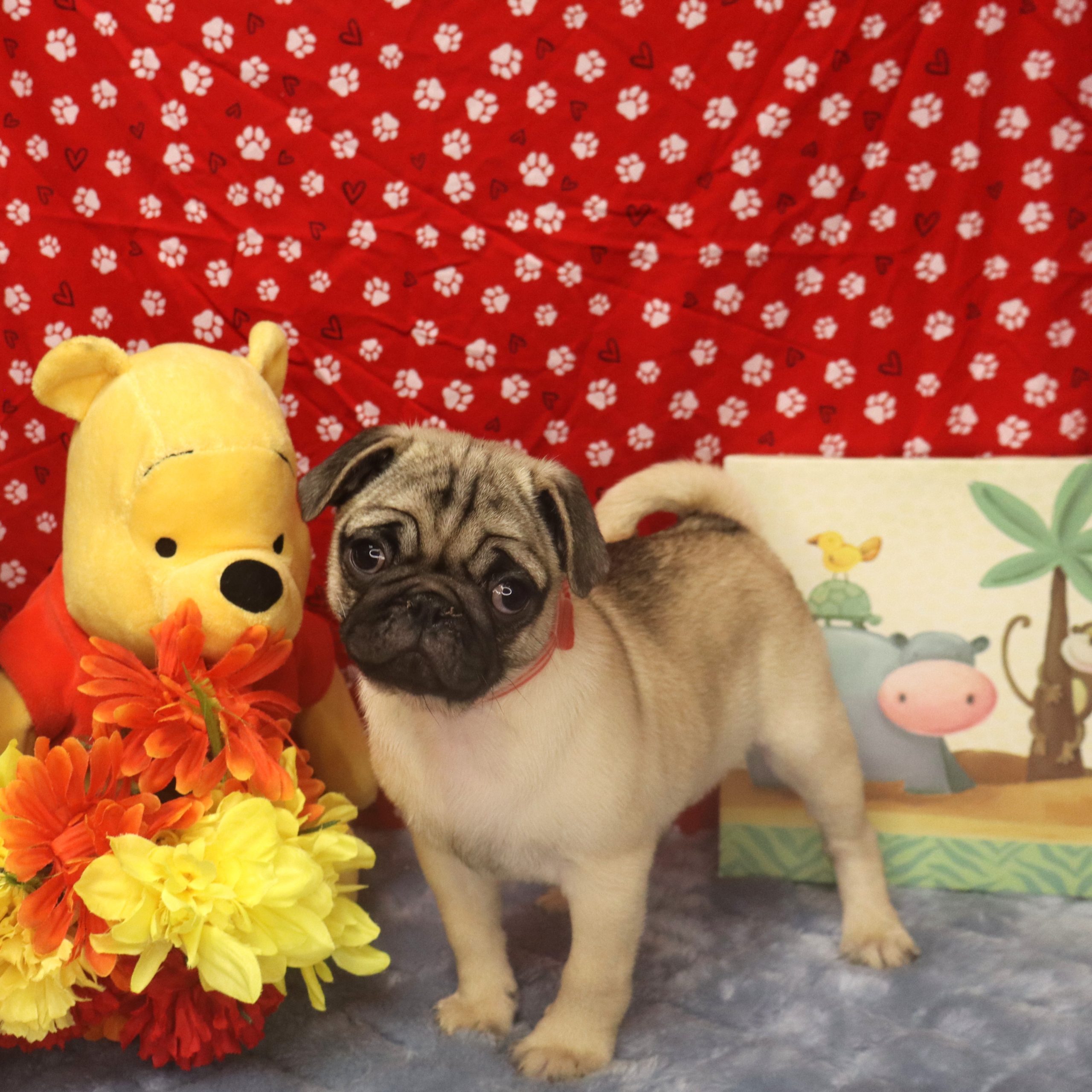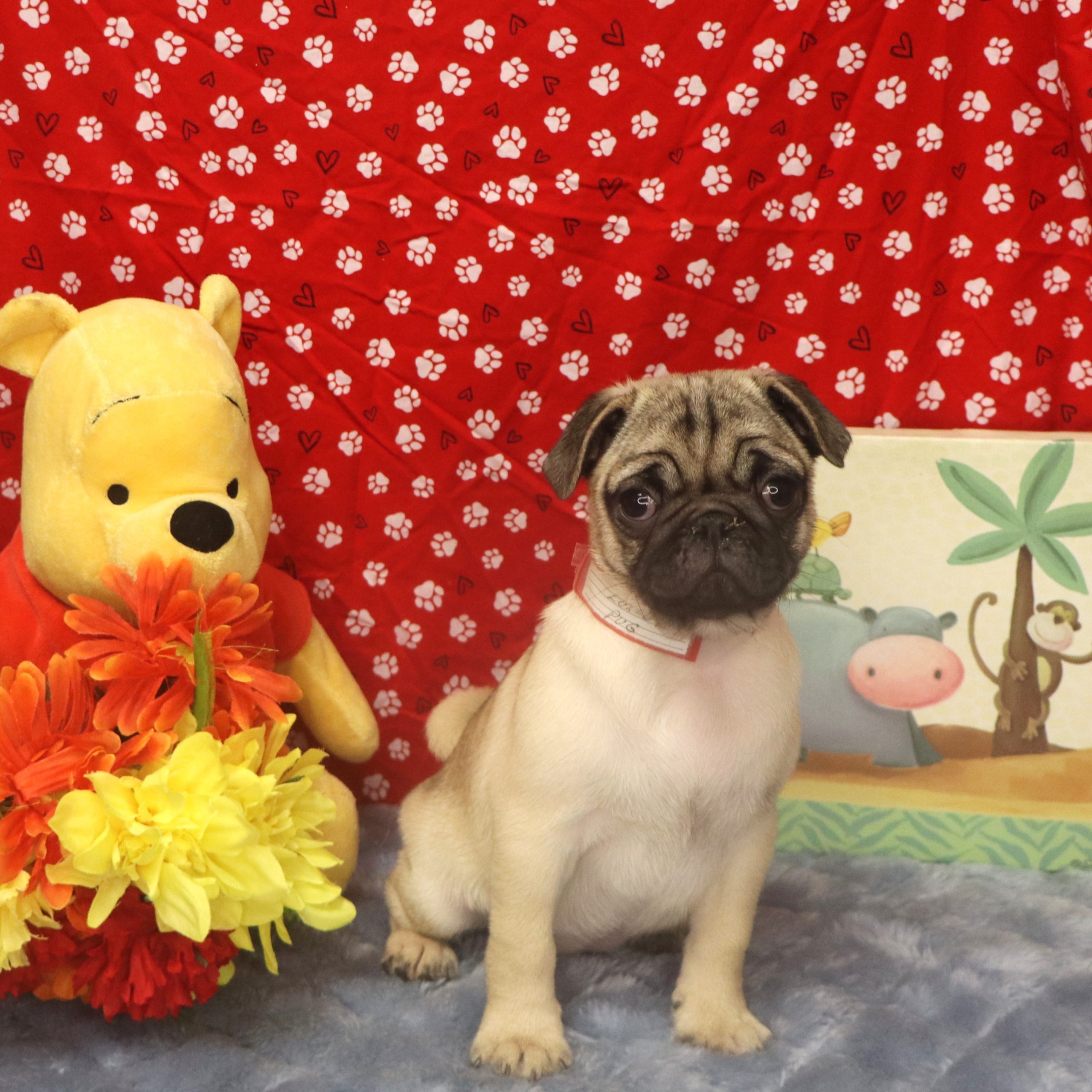 Fawn pug puppy with plush bear and flowers