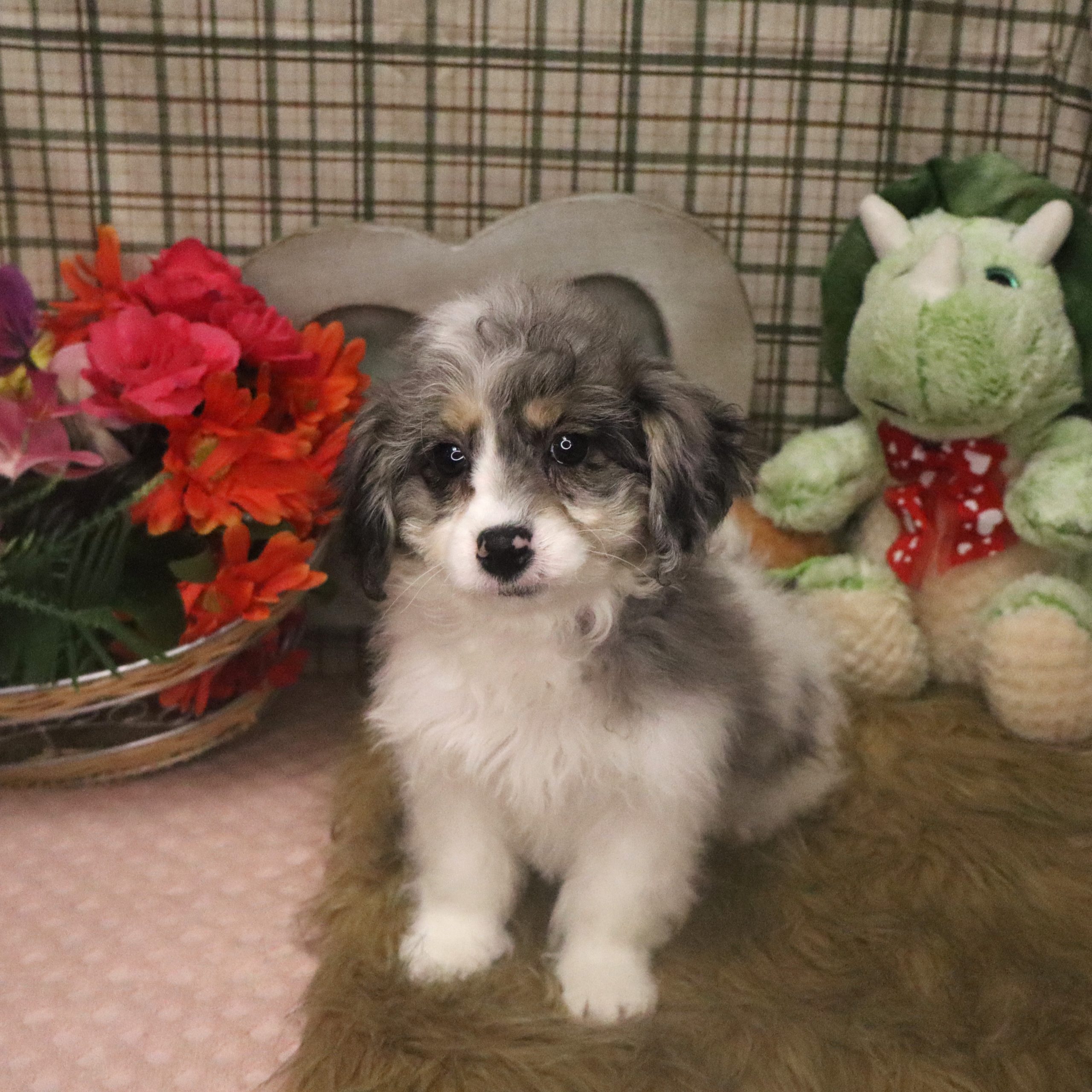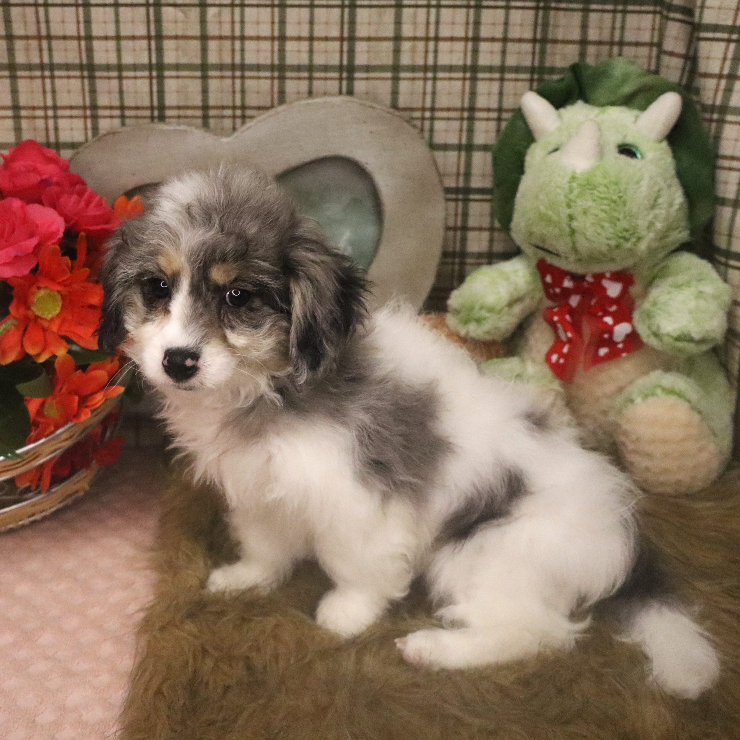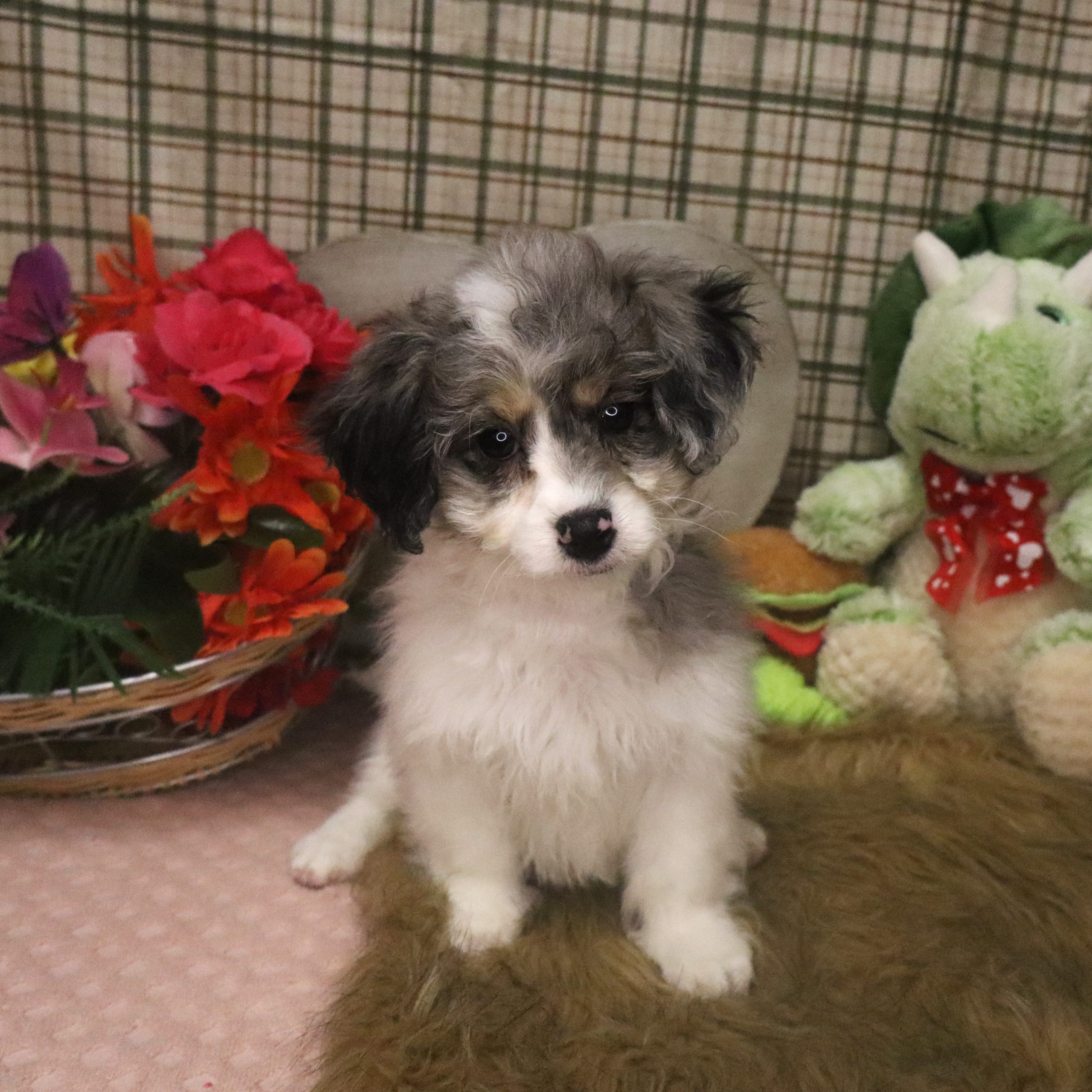 There are six in this litter, three males and three females. Roxie is a brown and white ICA registered Shihpoo, and she weighs 12#. Tommy is a blue merle ICA registered Poodle, and he weighs 10#.