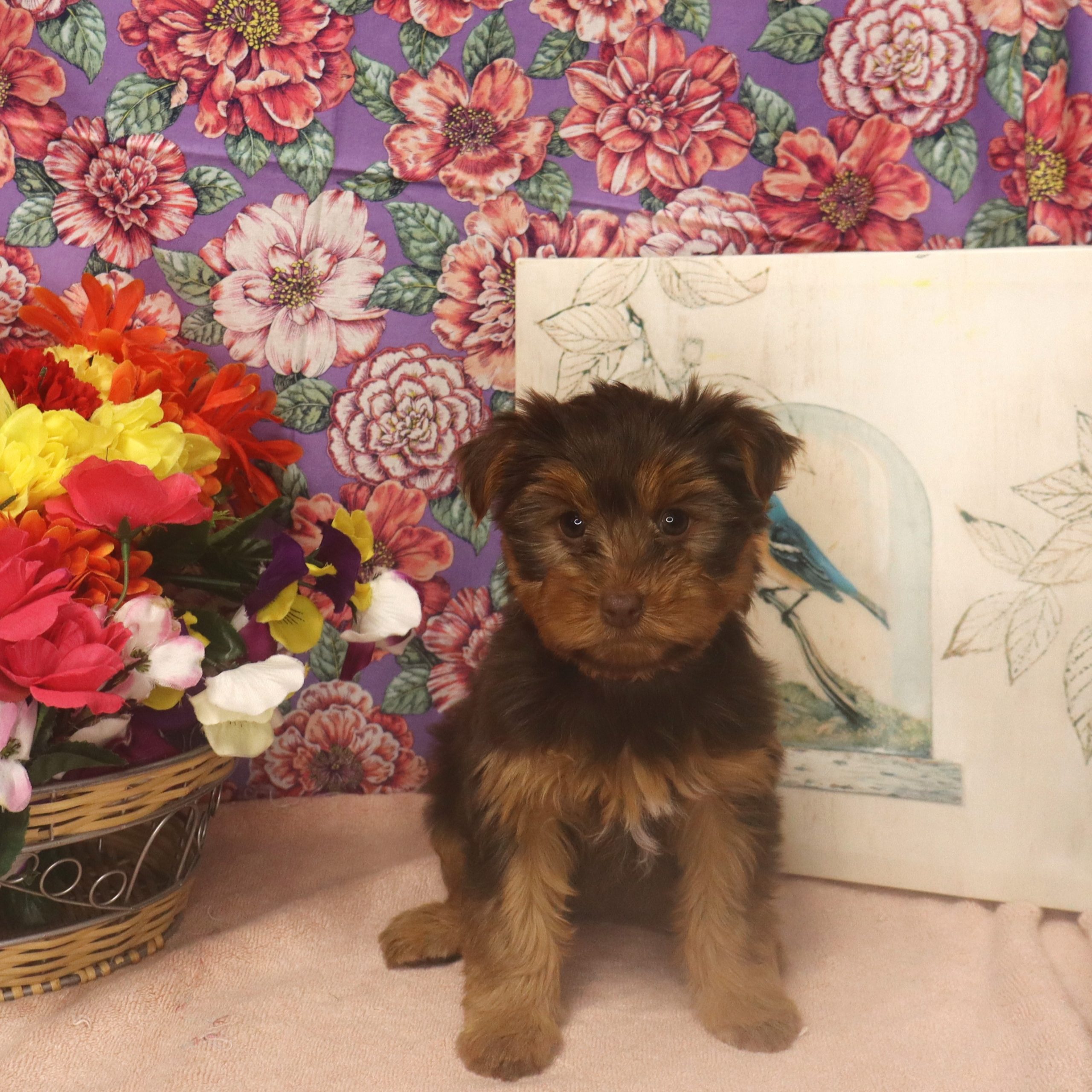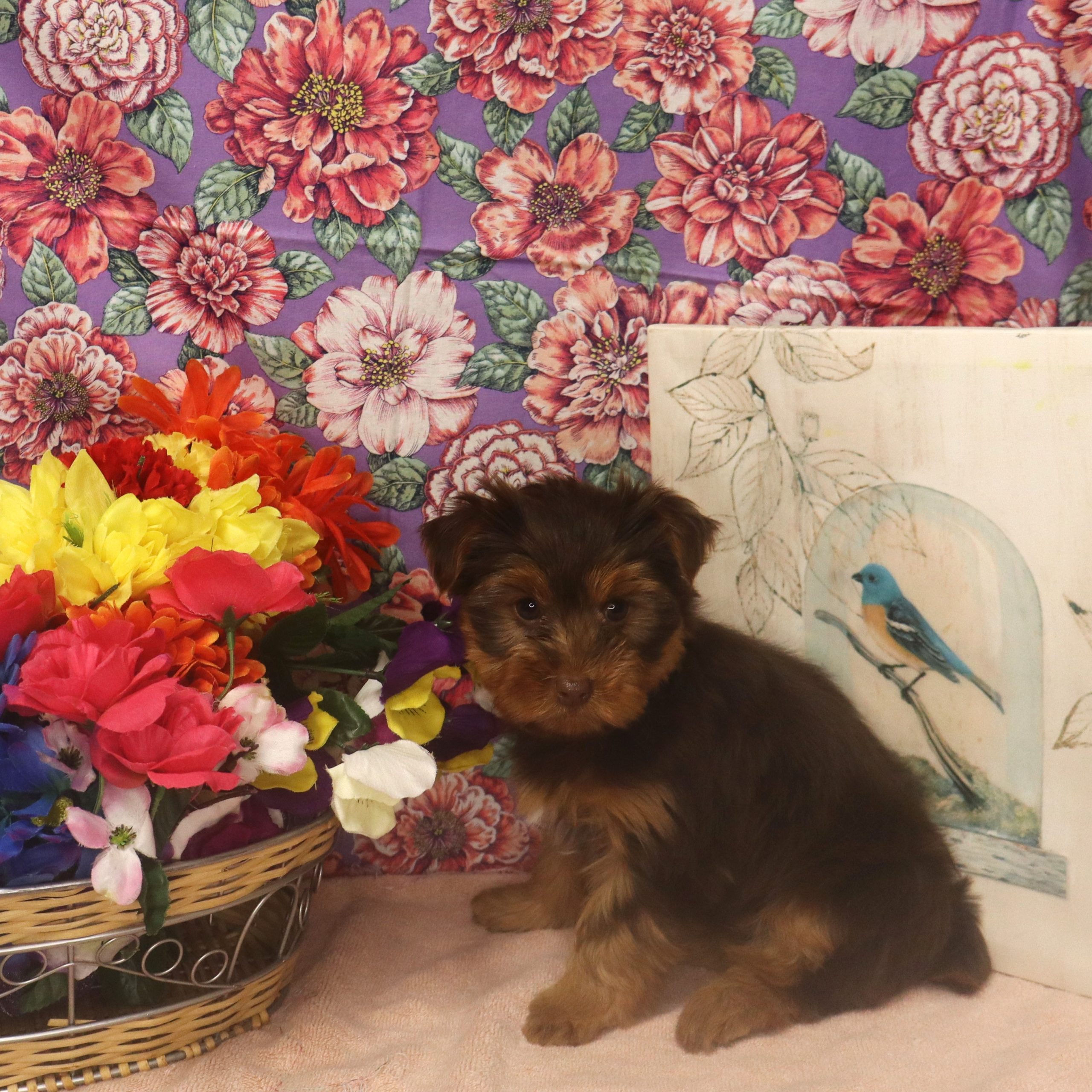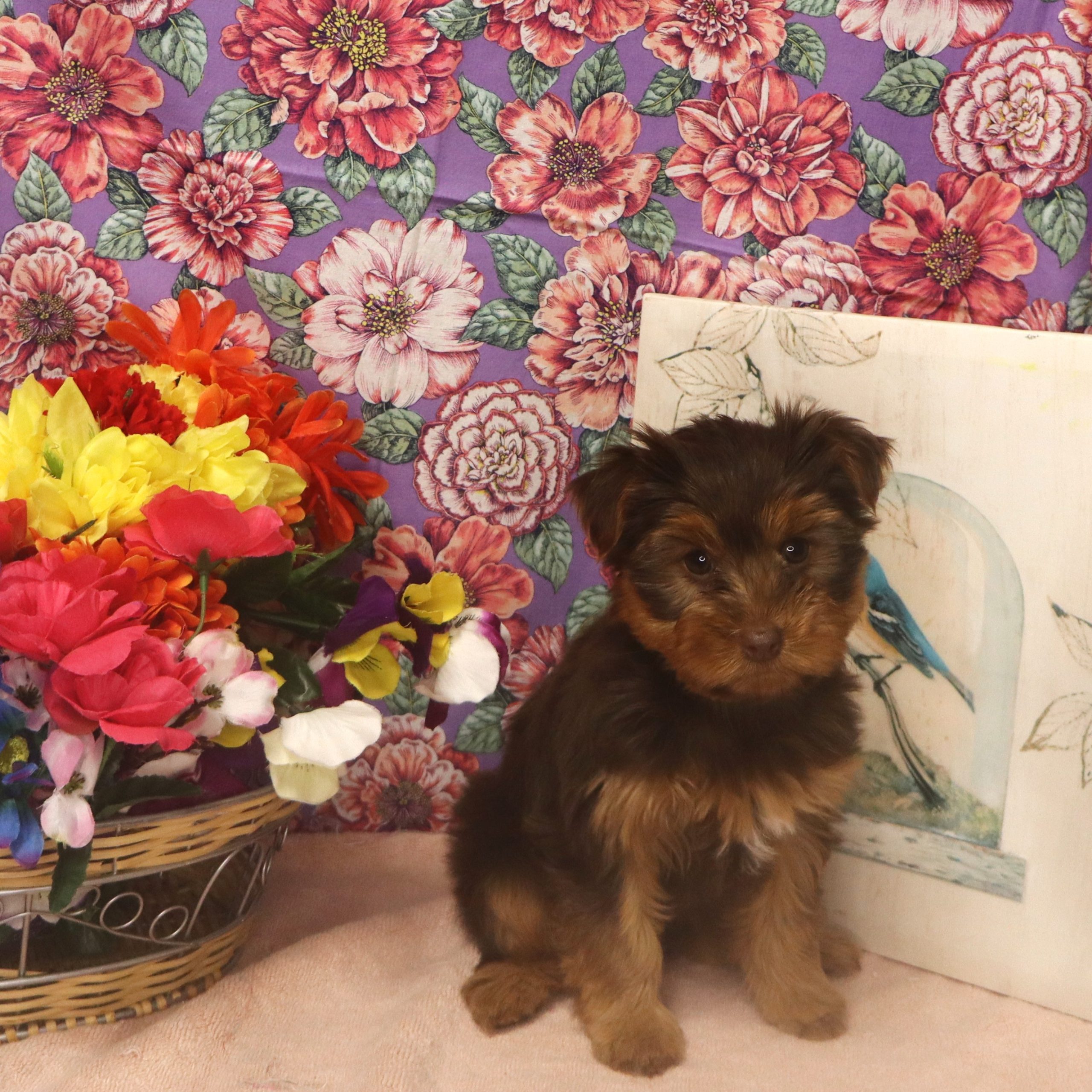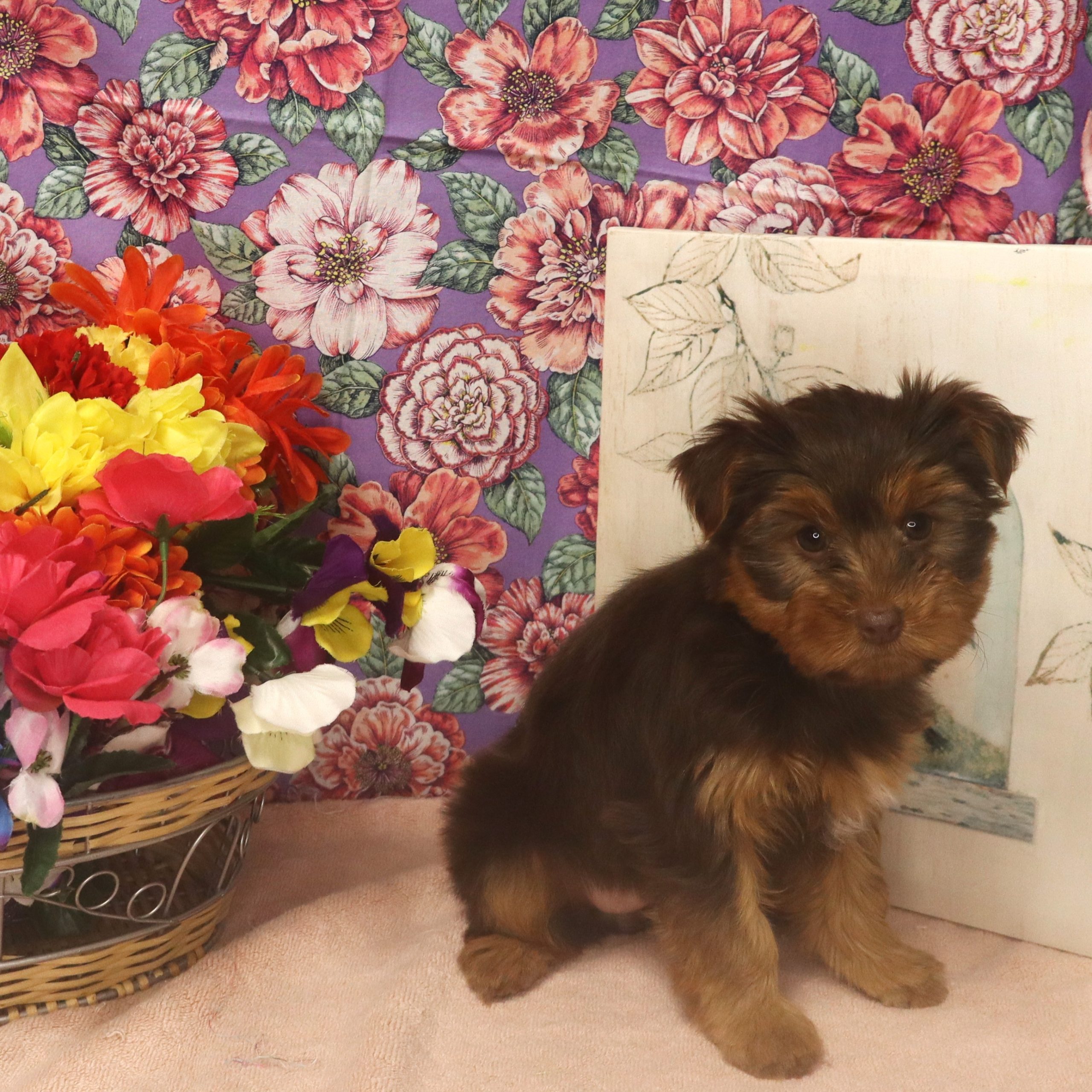 Tiny brown puppy beside vibrant flower basket