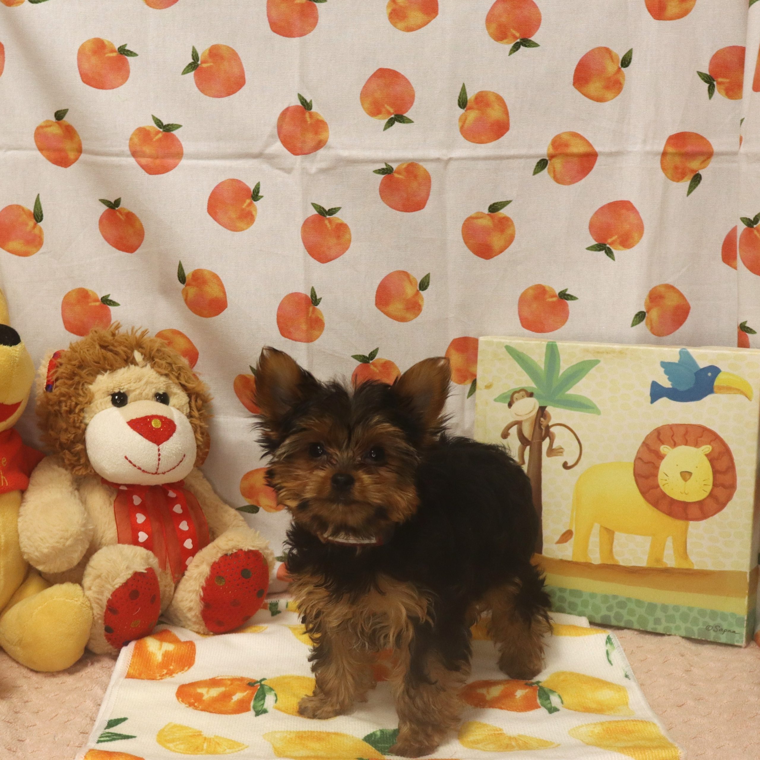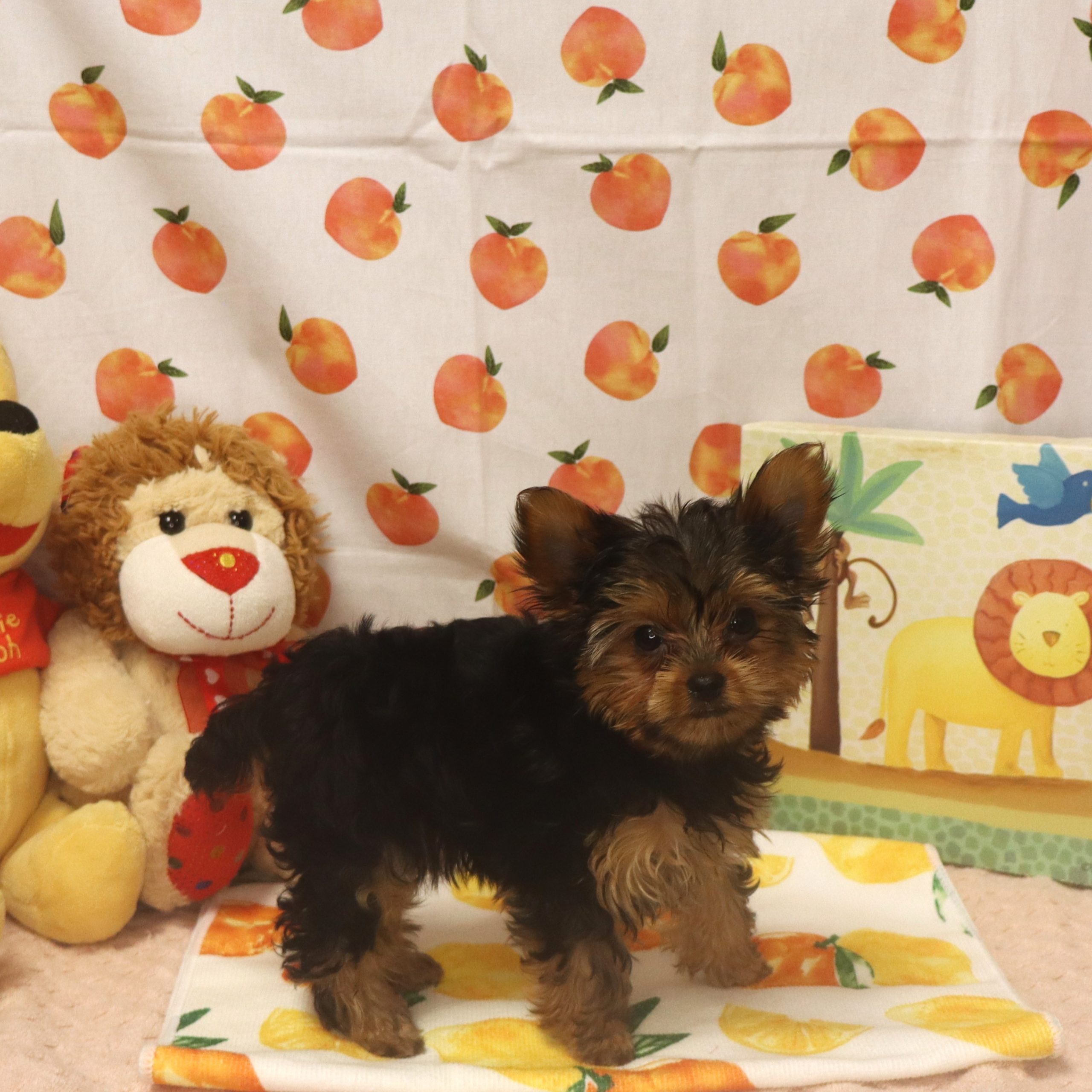 Tiny Yorkshire terrier puppy with stuffed lion